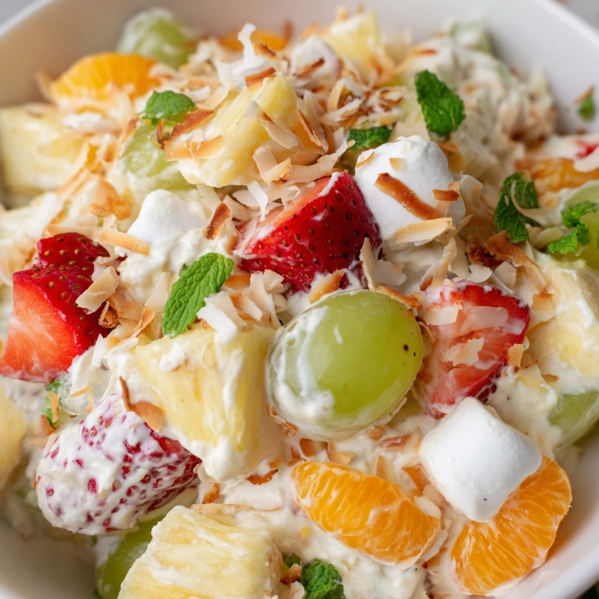 This tropical dessert combines a rich, creamy cheesecake base with vibrant fresh fruits including pineapple, strawberries, mandarin oranges, grapes, and banana. The sweet cream cheese mixture comes together in just 15 minutes and requires no baking. After chilling to let flavors meld, the result is a luscious, refreshing treat perfect for warm weather gatherings or potlucks. Optional marshmallows add extra sweetness while toasted coconut and mint provide an elegant finishing touch.